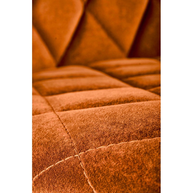 - Siedzisko i oparcie: Tapicerowane stylową aksamitną tkaniną typu velvet (BLUVEL 4215) w kolorze cynamonowym – miękka, puszysta struktura jest przyjemna w dotyku i tworzy efekt głębokiego, ciepłego koloru, który ociepla wnętrze.