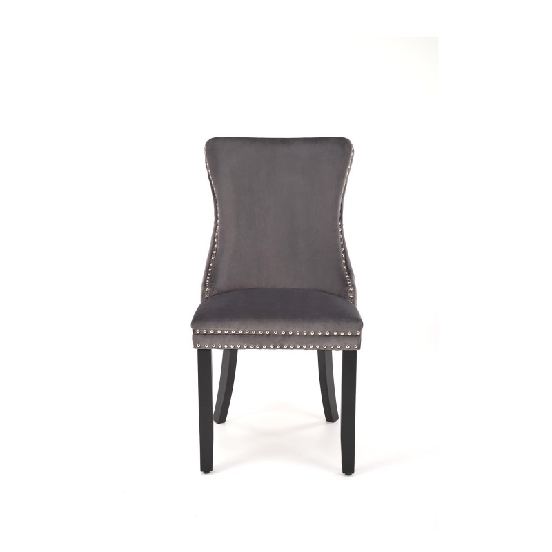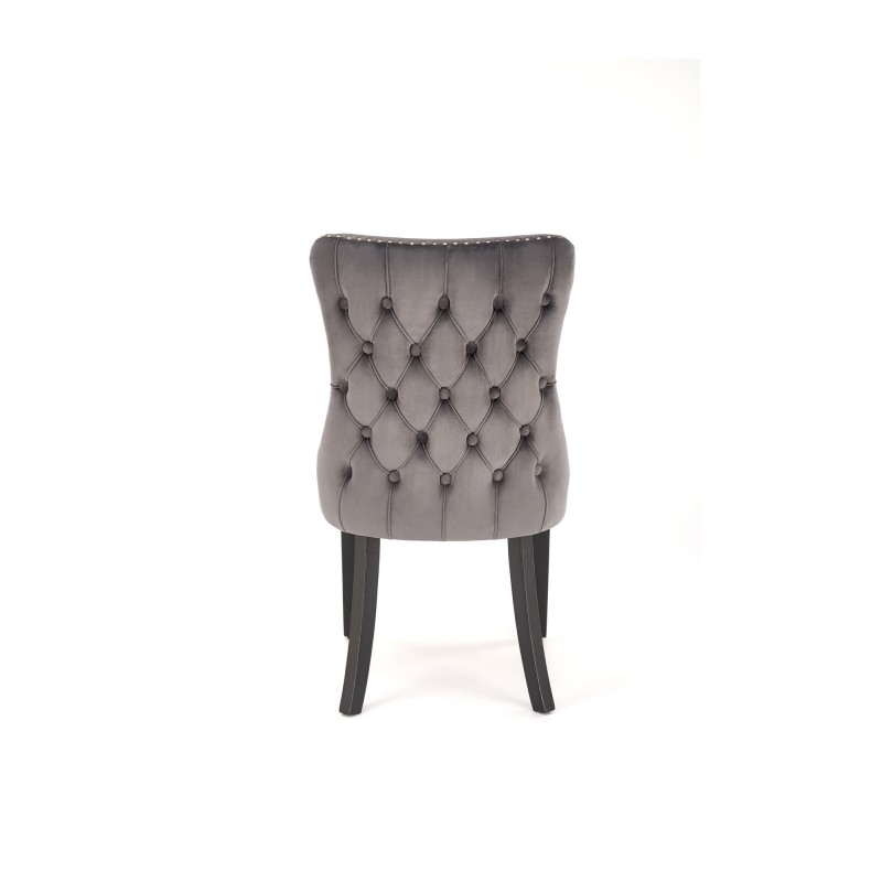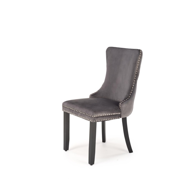 Stylowe krzesło ALDA z tapicerką velvet w kolorze popielatym (HLR 18), na prostych nogach z litego drewna. Ozdobne pikowanie z tyłu oparcia podkreśla elegancję w stylu glamour. Idealne do jadalni, salonu, restauracji czy hotelowego wnętrza.