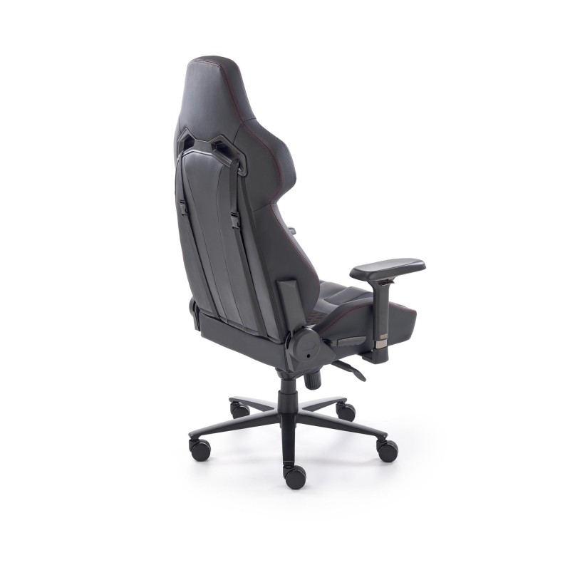 - Siedzisko w odcieniach szarości i czerni: Szerokie i komfortowo wyprofilowane siedzisko pokryte jest wysokiej jakości eko skórą w kolorze ciemnego popielu z czarnymi akcentami. To połączenie barw tworzy nowoczesny, stonowany i bardzo profesjonalny wygląd, idealny do gabinetów dyrektorskich i nowoczesnych biur. Eko skóra jest materiałem łatwym w czyszczeniu, odpornym na ścieranie i przyjemnym w dotyku.