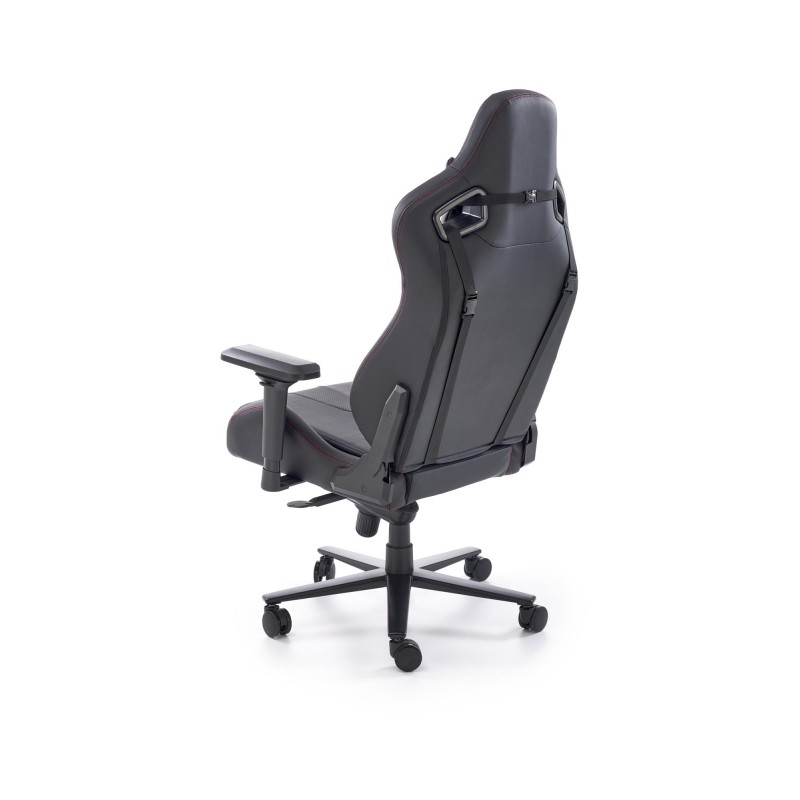 - Siedzisko z czarnej eko skóry: Szerokie i komfortowo wyprofilowane siedzisko pokryte jest wysokiej jakości czarną eko skórą. Materiał ten imituje wygląd naturalnej skóry, nadając fotelowi luksusowy charakter. Jest niezwykle łatwy w czyszczeniu, odporny na ścieranie i przyjemny w dotyku, co czyni go idealnym wyborem do intensywnego użytkowania.