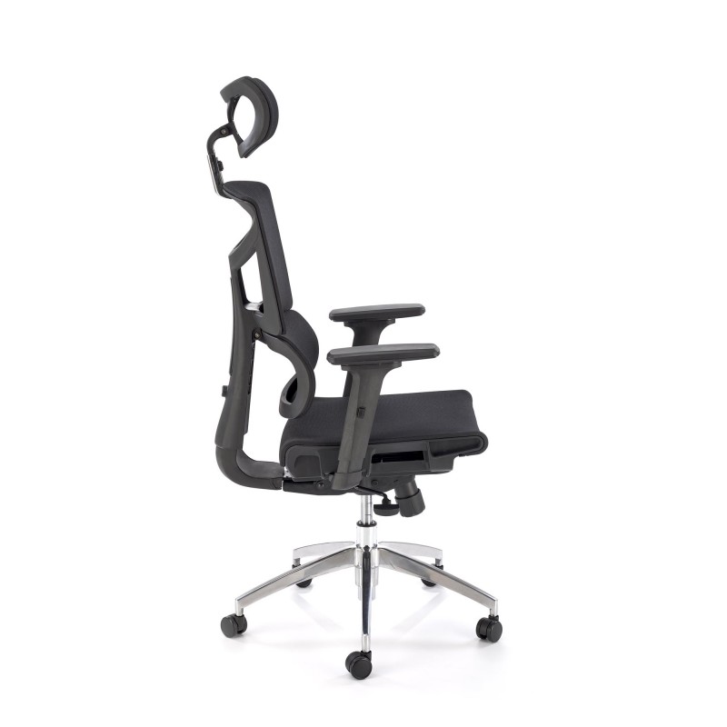 Fotel gabinetowy MARCUS w kolorze czarnym to flagowy model ergonomiczny z pełną tapicerką z czarnej tkaniny (siedzisko i oparcie). Wyróżnia się kompleksem zaawansowanych regulacji: wysuwane siedzisko, regulowana wysokość oparcia, regulowany zagłówek oraz wielokierunkowe podłokietniki, co pozwala idealnie dopasować fotel do każdej sylwetki. Wyposażony w zdrowy mechanizm synchroniczny z blokadą i kołysaniem oraz ekskluzywną aluminiową podstawę. MARCUS to najlepszy wybór dla osób ceniących miękką tkaninę, najwyższy komfort, zdrowy kręgosłup i prestiżowy design w biurze.