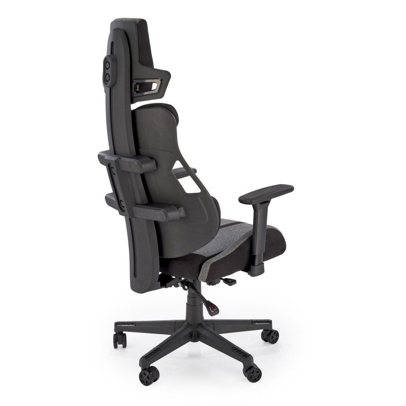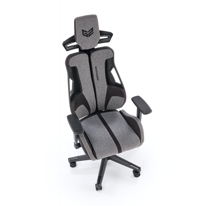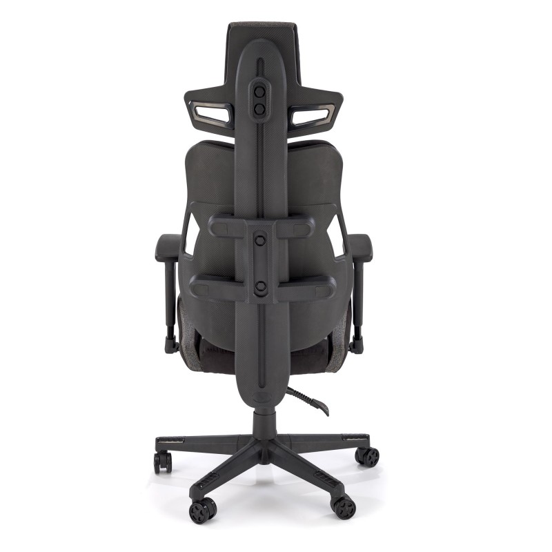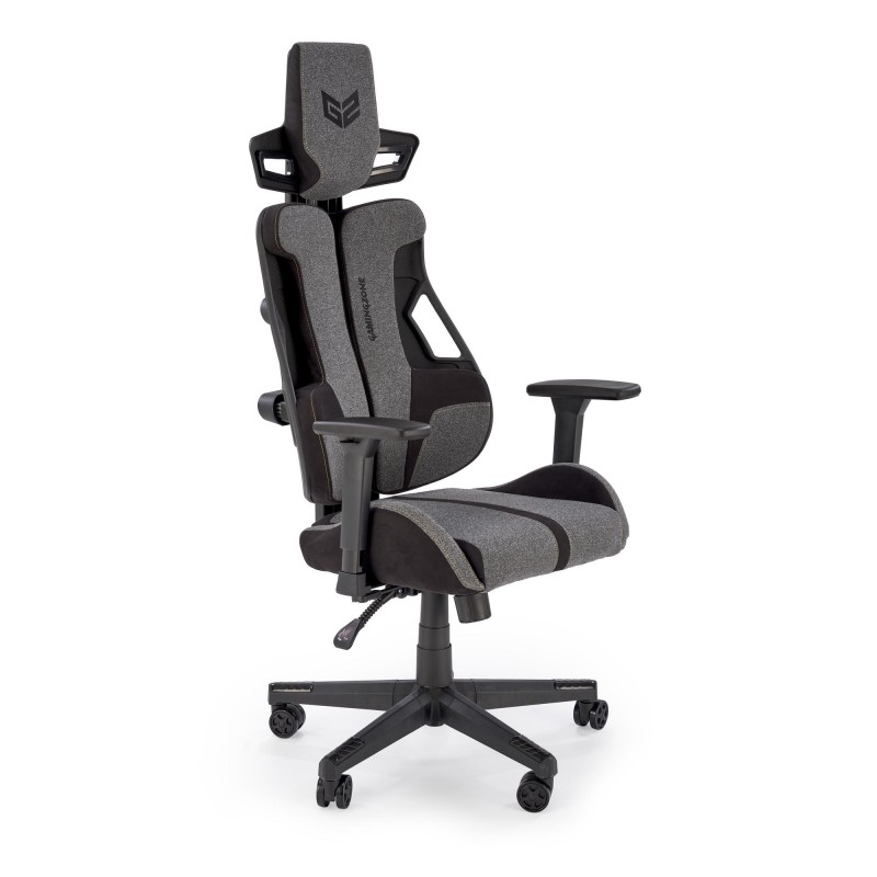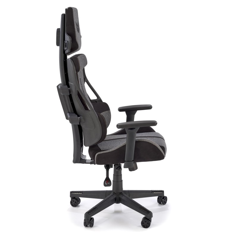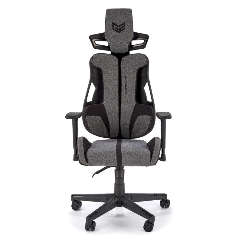 - Siedzisko i oparcie z tkaniny: Całość pokryta jest wysokiej jakości tkaniną obiciową w kolorze czarnym z charakterystycznymi popielatymi (szarymi) wstawkami. W przeciwieństwie do eko skóry, tkanina zapewnia doskonałą cyrkulację powietrza, zapobiegając przegrzewaniu się i poceniu się nawet podczas intensywnej gry czy nauki. Szare akcenty nadają fotelowi bardziej profesjonalnego i nowoczesnego wyglądu niż klasyczne, jaskrawe kolory.
