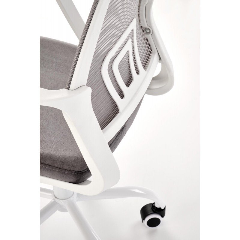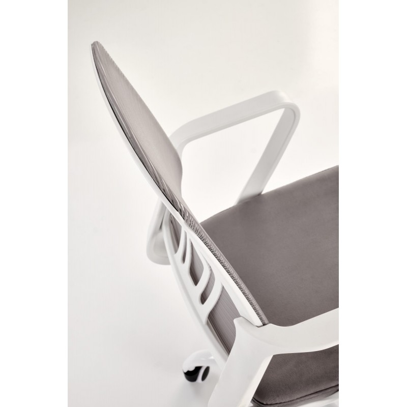 Fotel młodzieżowy FRODO – elegancki popiel, miękki welur, siatkowe oparcie i biała metalowa baza
