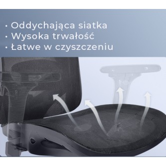 - Siedzisko i oparcie z siatki: Cała powierzchnia styku wykonana jest z wysokiej jakości siatki, która zapewnia stały przepływ powietrza. To gwarancja komfortu termicznego nawet w upalne dni i podczas wielogodzinnej pracy bez uczucia pocenia się.