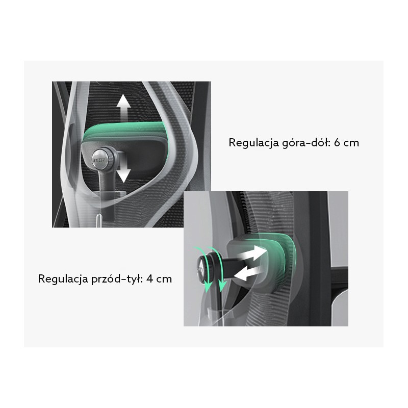 - Lędźwie 2D: System pozwala na precyzyjną regulację podpory w dwóch płaszczyznach: góra-dół (6 cm) oraz głębokości (4 cm). Dzięki temu możesz ustawić wsparcie dokładnie w miejscu naturalnej krzywizny kręgosłupa, zapewniając stabilność dolnych partii pleców i redukując zmęczenie.