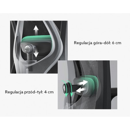 - Podparcie lędźwiowe: Tak, regulowane 2D (wysokość 6 cm, głębokość 4 cm)