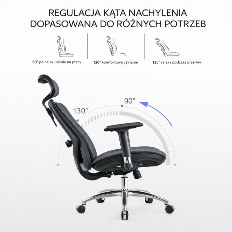 - Blokada w 3 pozycjach: Mechanizm umożliwia zablokowanie oparcia w trzech precyzyjnie wyznaczonych kątach: 110°, 120° i 130°. Pozwala to na wybór idealnej pozycji do pracy lub relaksu.