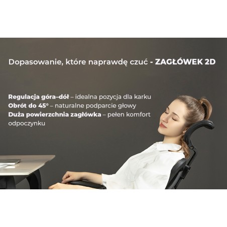 - Zagłówek 2D: Regulacja wysokości w szerokim zakresie (0–9 cm) pozwala dopasować podparcie szyi i karku do wzrostu użytkownika. Utrzymanie głowy w neutralnej pozycji skutecznie redukuje napięcia mięśniowe podczas pracy przy monitorze.
