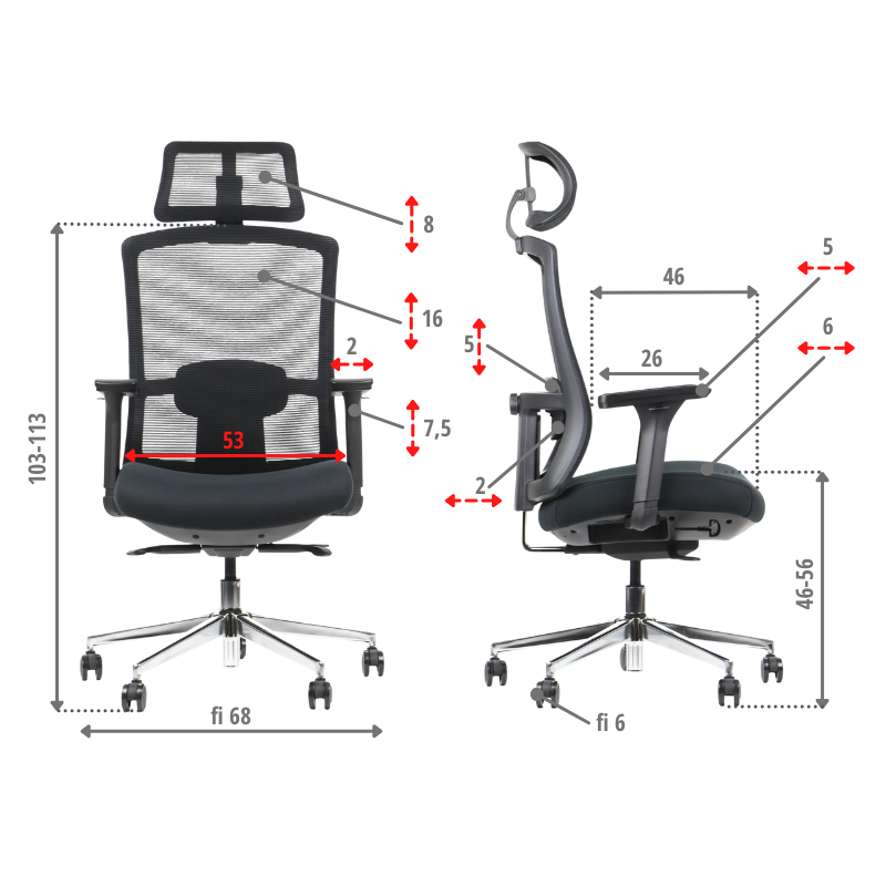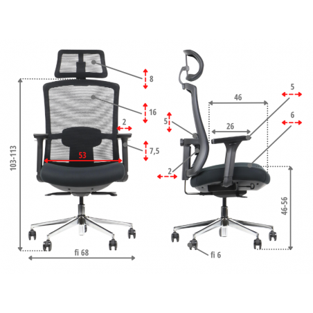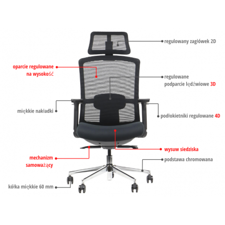 - regulowany zagłówek, podparcie lędźwiowe i podłokietniki dla zdrowej pozycji