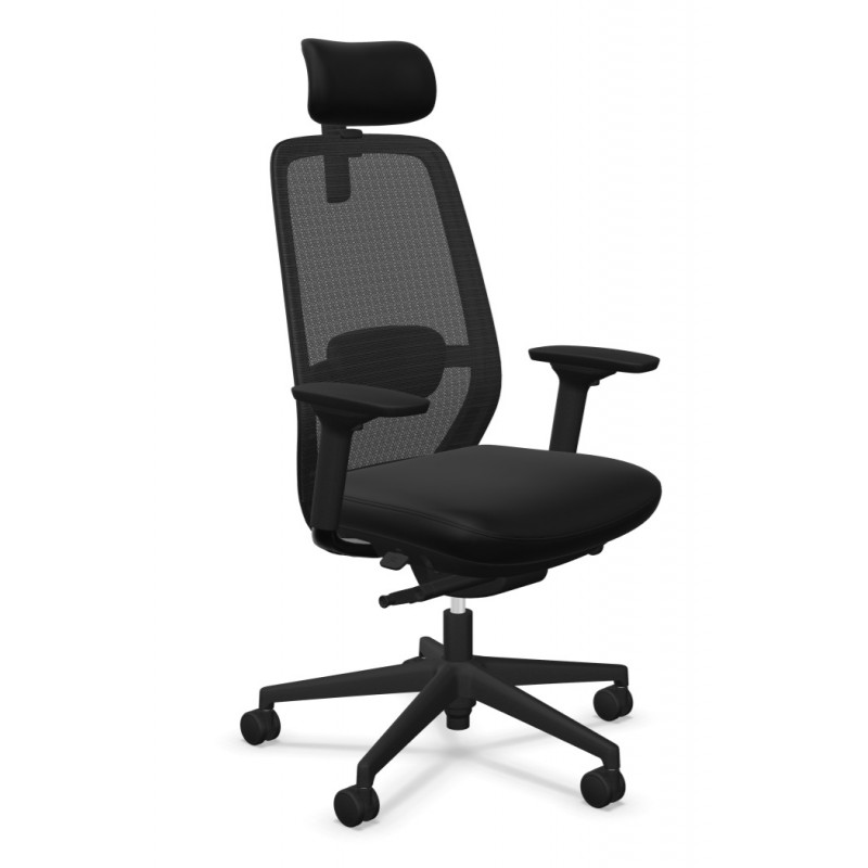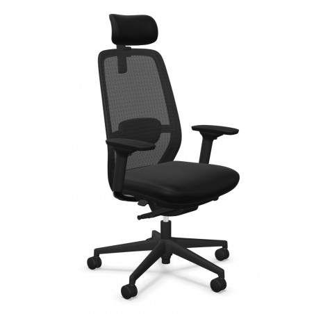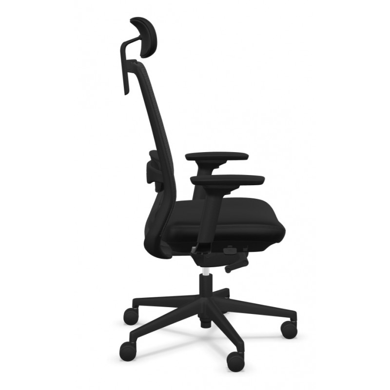 Krzesło Elovie wyróżnia się wyposażeniem najwyższej klasy. Zastosowano tu zaawansowane podłokietniki 4D wykonane z czarnego tworzywa. Można je regulować aż w czterech płaszczyznach: góra/dół, przód/tył, na boki oraz obrót. Pozwala to na idealne dopasowanie podpory dla łokci i przedramion, skutecznie odciążając barki i kark. Całość osadzona jest na solidnej, 5-ramiennej podstawie z czarnego poliamidu, wyposażonej w kółka Ø 60 mm przeznaczone do twardych powierzchni. Czarna kolorystyka wszystkich elementów tworzy spójną, monochromatyczną i profesjonalną całość.