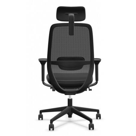- Oparcie i zagłówek z siatki EMD: Wysokie, ergonomicznie wyprofilowane oparcie oraz regulowany zagłówek wykonane są z elastycznej siatki EMD w kolorze czarnym. Siatka ta gwarantuje doskonałą cyrkulację powietrza, zapobiegając przegrzewaniu się pleców, a jej sprężystość dynamicznie dopasowuje się do ruchów użytkownika. Zagłówek jest tapicerowany, co zwiększa komfort podparcia głowy.