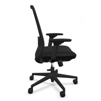 Krzesło Elovie wyróżnia się wyposażeniem najwyższej klasy. Zastosowano tu zaawansowane podłokietniki 4D wykonane z czarnego tworzywa. Można je regulować aż w czterech płaszczyznach: góra/dół, przód/tył, na boki oraz obrót. Pozwala to na idealne dopasowanie podpory dla łokci i przedramion, skutecznie odciążając barki i kark, nawet przy braku zagłówka. Całość osadzona jest na solidnej, 5-ramiennej podstawie z czarnego poliamidu, wyposażonej w kółka Ø 60 mm przeznaczone do twardych powierzchni. Czarna kolorystyka wszystkich elementów tworzy spójną, monochromatyczną i profesjonalną całość.
