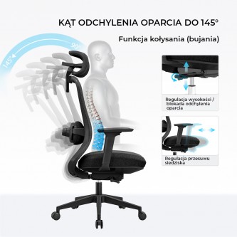 - Blokada w 5 pozycjach: Mechanizm umożliwia zablokowanie oparcia w pięciu precyzyjnych kątach: 90°, 110°, 125°, 135° i 145°. Pozwala to na idealne dopasowanie pozycji do każdego zadania – od skupionej pracy po głęboki relaks z odchylonym oparciem.