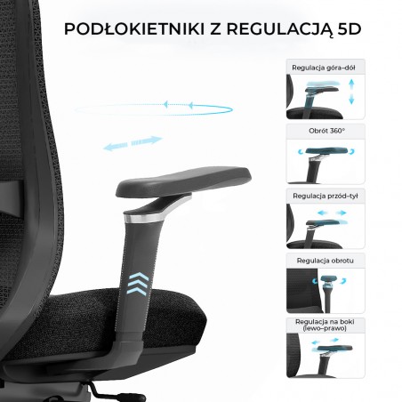 - Podłokietniki: 5D (góra/dół, przód/tył, bok, obrót nakładki, obrót 360°)