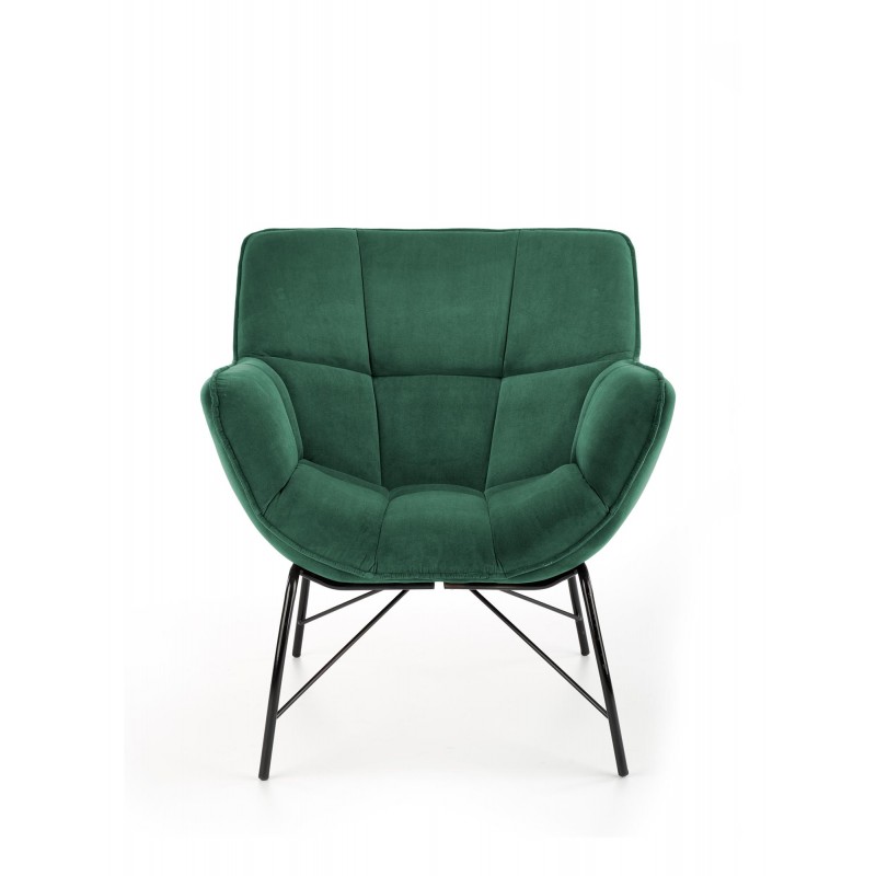 Fotel wypoczynkowy BELTON w kolorze ciemny zielony HLR 57 to nowoczesny mebel tapicerowany stylową aksamitną tkaniną velvet. Wygodne, szerokie siedzisko zapewnia komfort wypoczynku. Oryginalny metalowy stelaż ze stali malowanej proszkowo w kolorze czarnym gwarantuje trwałość i stabilność. Ciekawy, modny design sprawia, że fotel idealnie sprawdzi się w nowoczesnych wnętrzach, łącząc funkcjonalność z eleganckim wyglądem.