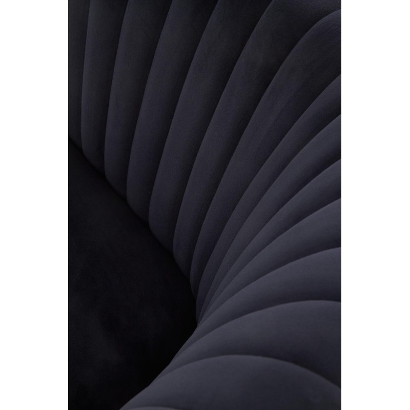 Charakterystyczną cechą tkanin aksamitnych jest efekt delikatnego połyskiwania i zmieniania odcieni wraz z kątem patrzenia na nie, co można zaobserwować przy odpowiednim oświetleniu. Dodatkowo oparcie i siedzisko zostało upiększone efektownym pikowaniem, które dodaje uroku i podkreśla glamourowy charakter mebla. Złote metalowe nóżki nadają fotelowi prestiżowego wyglądu i stanowią idealny kontrast z czarną tapicerką.