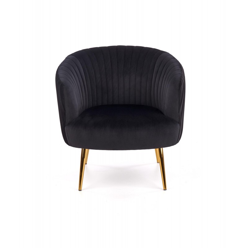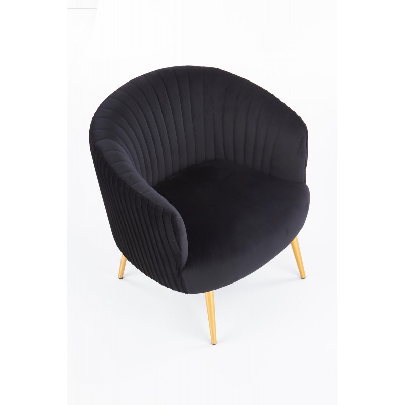 Fotel wypoczynkowy CROWN w kolorze czarnym ze złotymi nóżkami to luksusowa propozycja łącząca klasyczny styl z estetyką glamour. Fotel tapicerowany jest estetyczną tkaniną typu velvet. Ten wysokogatunkowy materiał nadaje powierzchni mebla wyjątkowej gładkości i miękkości, co sprawia, że siedzenie na nim jest bardzo przyjemne.