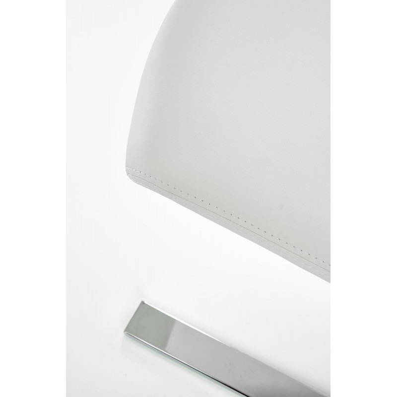 - Siedzisko i oparcie: Tapicerowane wysokiej jakości eko-skórą w kolorze białym – miękka, lekko strukturalna powierzchnia zapewnia komfort i łatwość czyszczenia. Idealna dla codziennego użytku w jadalni czy salonie.