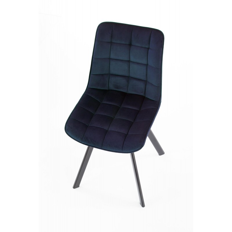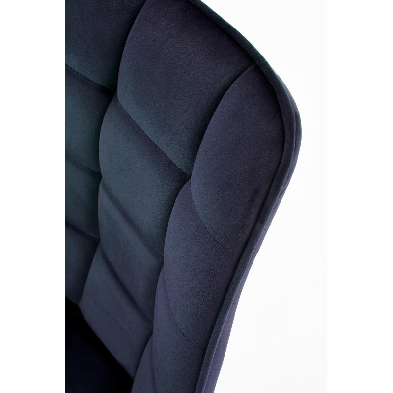 - Siedzisko i oparcie: Tapicerowane stylową tkaniną typu velvet w kolorze granatowym – miękka, puszysta struktura jest przyjemna w dotyku i wprowadza do wnętrza atmosferę luksusu.
