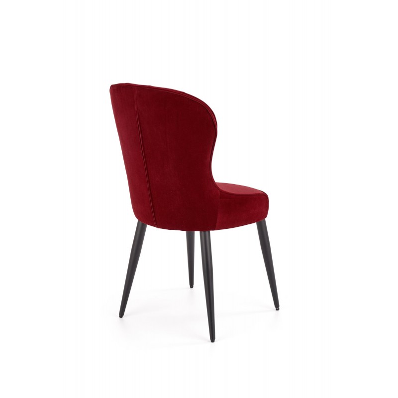Krzesło K366 bordowe to kwintesencja luksusu i elegancji. Tapicerka z aksamitnego velvetu w głębokim odcieniu wina tworzy efektowny duet z minimalistyczną, czarną bazą na okrągłych nogach. Szerokie siedzisko zapewnia wysoki komfort, a modny design dodaje wnętrzu prestiżowego charakteru. Idealne do stylu glamour.