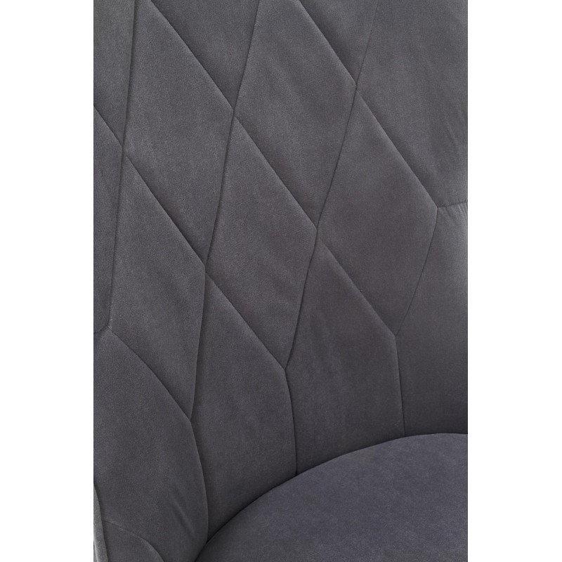 - Siedzisko i oparcie: Tapicerowane stylową tkaniną typu velvet w kolorze popiel – miękka, puszysta struktura jest przyjemna w dotyku i wprowadza do wnętrza przytulną atmosferę.