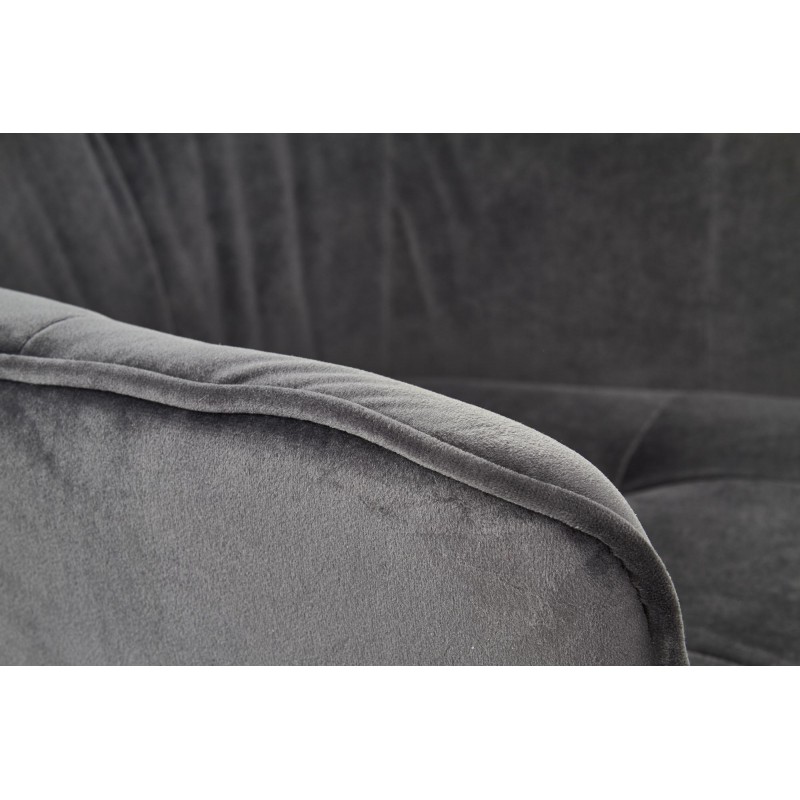 - Siedzisko i oparcie: Tapicerowane stylową tkaniną typu velvet w kolorze popiel – miękka, puszysta struktura jest przyjemna w dotyku i zapewnia wysoki komfort użytkowania.