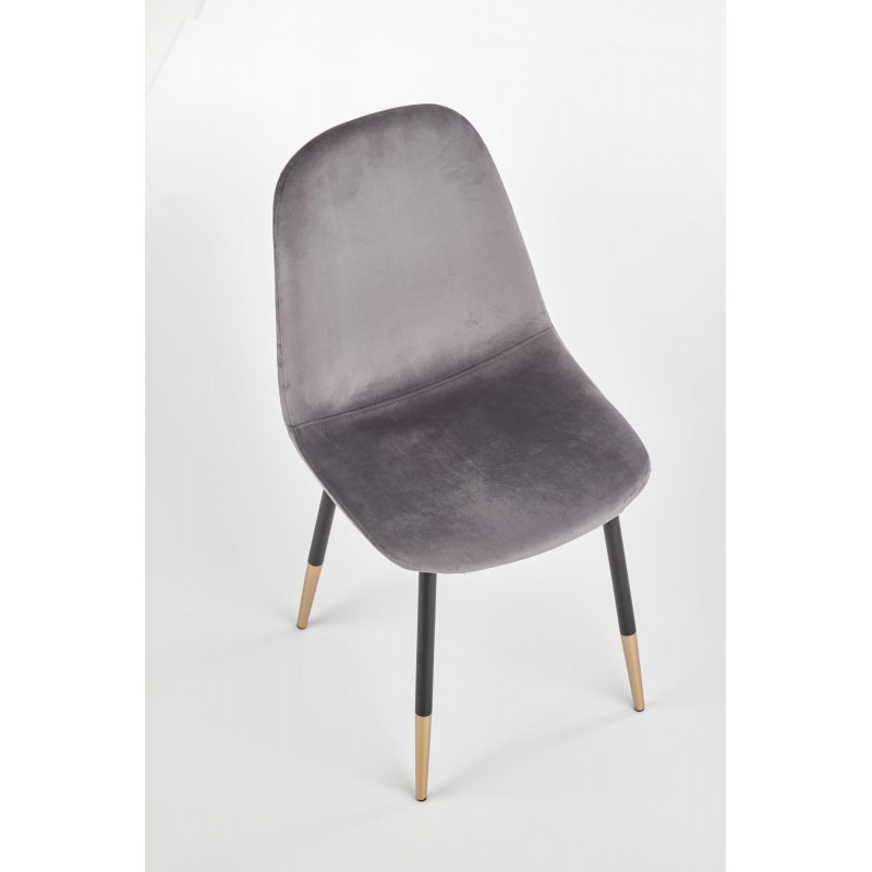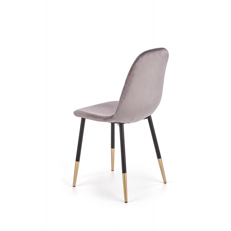 Krzesło K379 popielate to połączenie szlachetnego velvetu z eleganckimi detalami. Miękka tapiserka w odcieniu szarości (HLR 21) kontrastuje z czarnymi nogami ze złotymi końcówkami, dodającymi meblowi blasku. Szerokie siedzisko zapewnia wygodę, a unikalny design idealnie wpisuje się w styl glamour i nowoczesny.