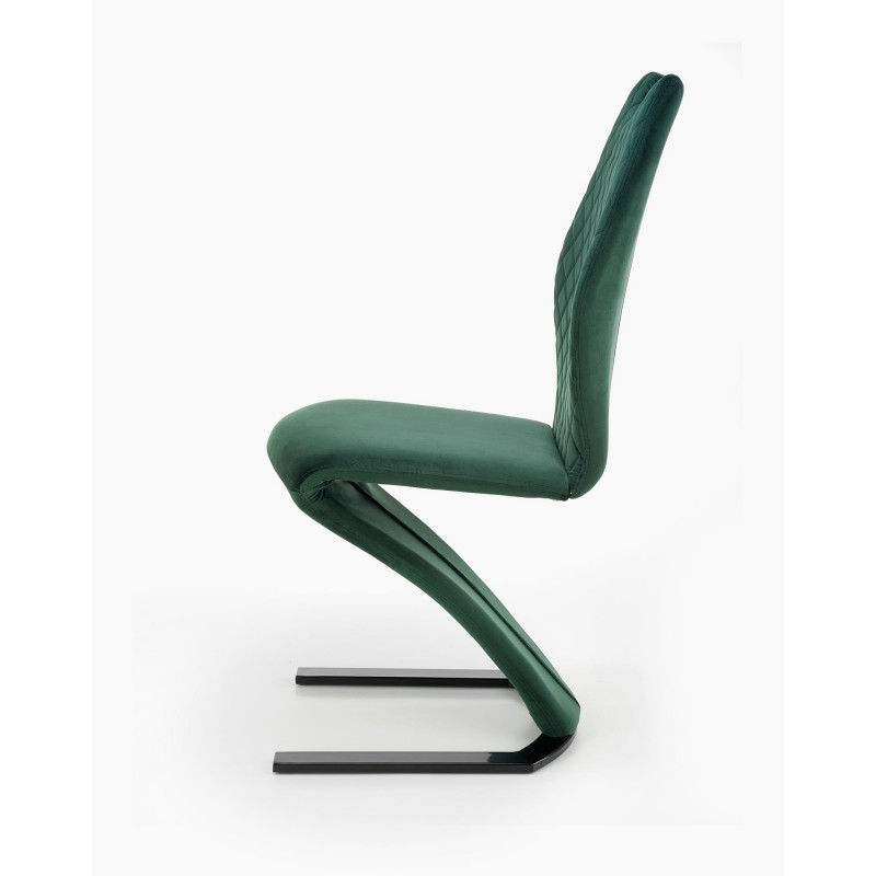 Krzesło K442 w ciemnym zielonym kolorze to połączenie luksusu i nowoczesnego designu. Głęboka, butelkowa zieleń tkaniny velvet BLUVEL 78 o subtelnym połysku przyciąga wzrok i dodaje wnętrzu elegancji. Metalowy stelaż malowany proszkowo z płozami zapewnia stabilność i nowoczesny charakter.