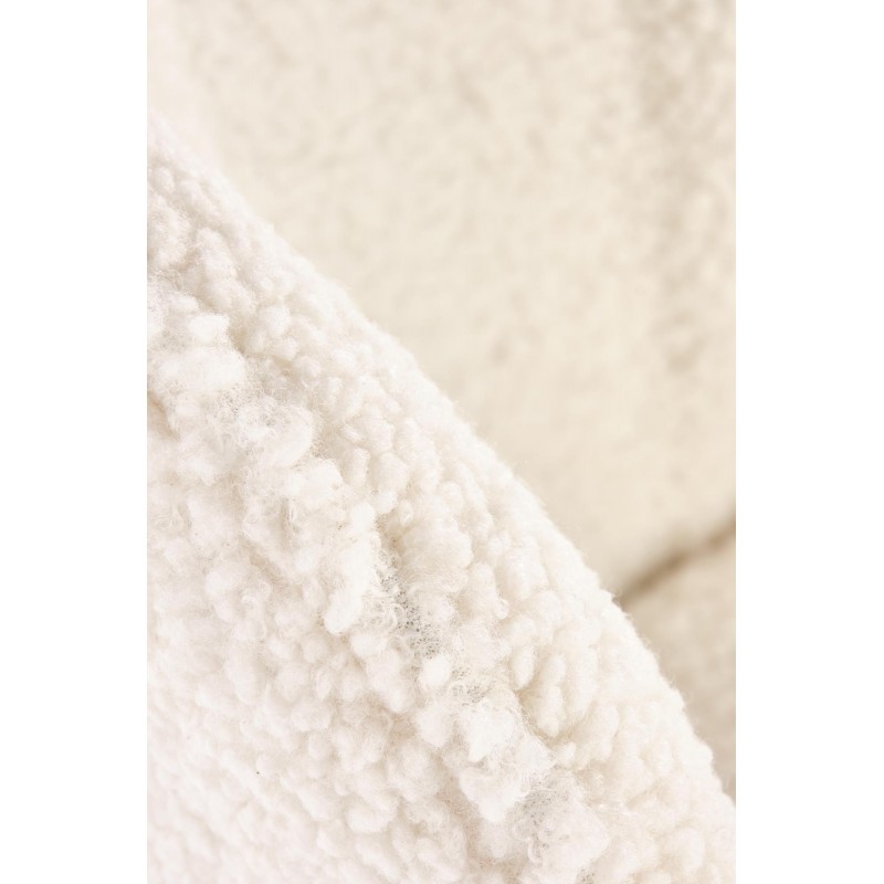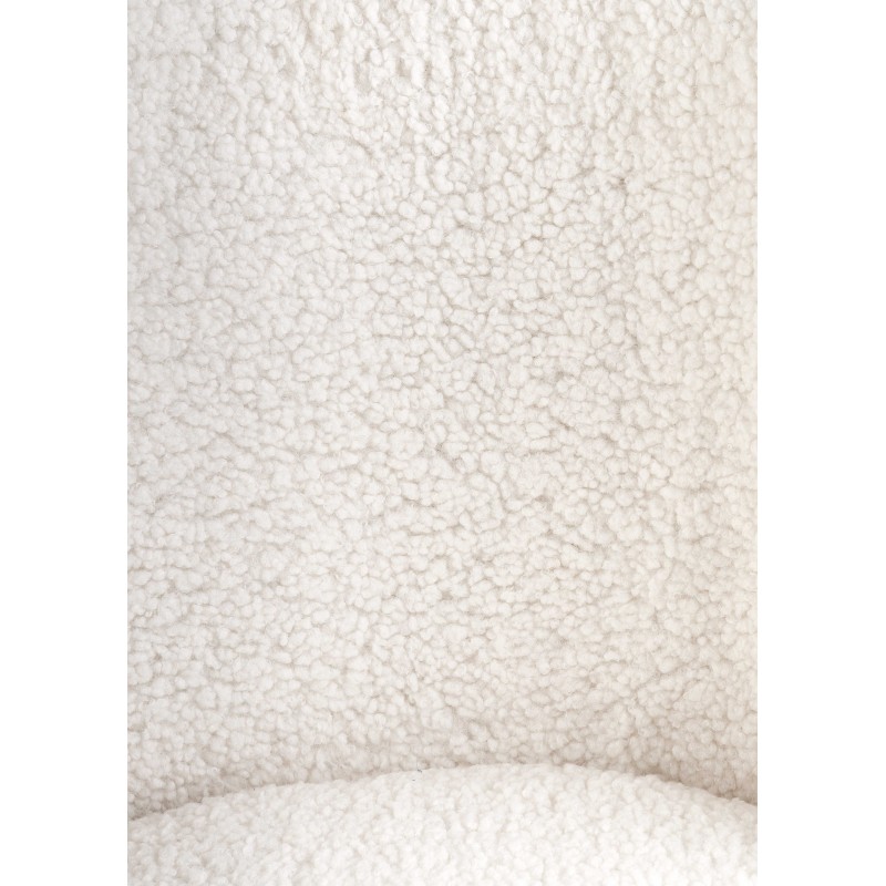 - Siedzisko i oparcie: Tapicerowane luksusową tkaniną typu boucle w kremowym kolorze – miękka, charakterystyczna faktura pętelkowa tworzy efekt przytulnego, eleganckiego wykończenia. Wygodne, szerokie siedzisko gwarantuje funkcjonalność i wygodę.