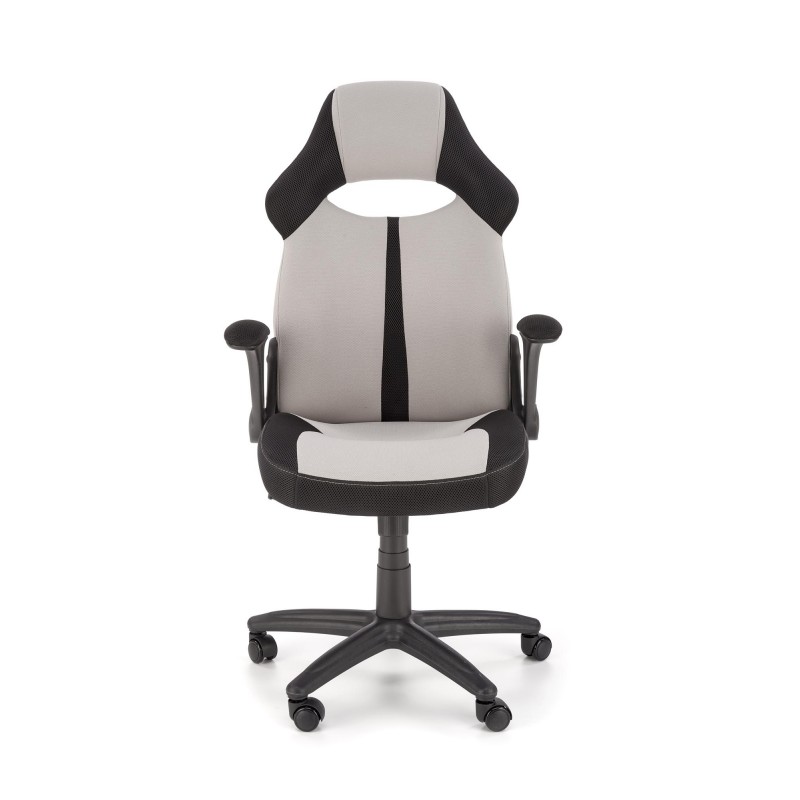 - Oparcie: Wysokie, ergonomicznie wyprofilowane, tapicerowane popielatą tkaniną membranową z charakterystycznymi czarnymi wstawkami – nowoczesna, dwukolorowa kompozycja nadaje fotelowi dynamicznego i profesjonalnego charakteru.
